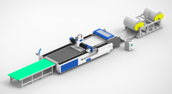 激光切割自動旋轉(zhuǎn)機床(俗稱;全自動卷料光纖激光切割機廠家,提供旋轉(zhuǎn)平臺光纖激光切割機,全自動卷料送料激光切割機,卷料激光切割生產(chǎn)線 滾動臺面光纖激光切割機,自動上料激光切割機,風(fēng)管激光切割機自動上料下料,通風(fēng)管道風(fēng)管激光切割生產(chǎn)線,風(fēng)管激光開料機,通風(fēng)管道光纖激光下料機,卷材全自動激光切割機送料設(shè)備):包括卷料料架,校平裝置,激光機床床體、接料平臺,自動刀條旋轉(zhuǎn)組件;工作原理:首次入料卷料通過校平機校平后進入激光切割平臺進行切割,切割完成后校平機自動送料,旋轉(zhuǎn)平臺自動把切割完成的配件輸送到接料平臺,校平機送料完成后系統(tǒng)運行切割第二張排版圖料件,同時可進行切好料件的編號收集工作,以此往復(fù)工作大大提高整體加工速度及效率。